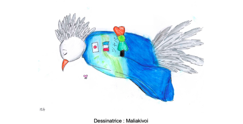 Bonjour. Enchantés. Nous sommes les 503 de Katiramona. Notre mascotte est un cagou. C’est un oiseau de Nouvelle-Calédonie. Il ne vole pas. Il porte un kimono qui ressemble à un paréo. Son kimono est de la couleur du lagon calédonien. Il y a aussi le drapeau du Japon et de la France. Le cagou est en train de saluer. C’est fini. Merci de votre attention. | |